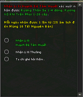 Lưu Ý : Phần thưởng đặc biệt khi nhận Lì Xi Huynh Đệ Tâm Huyết :Xác Suất nhận được Rương Thần sa 1- 4 dòng ( khóa), Rương trấn phái ( từ cấp 1 đến 20) ( khóa ) |